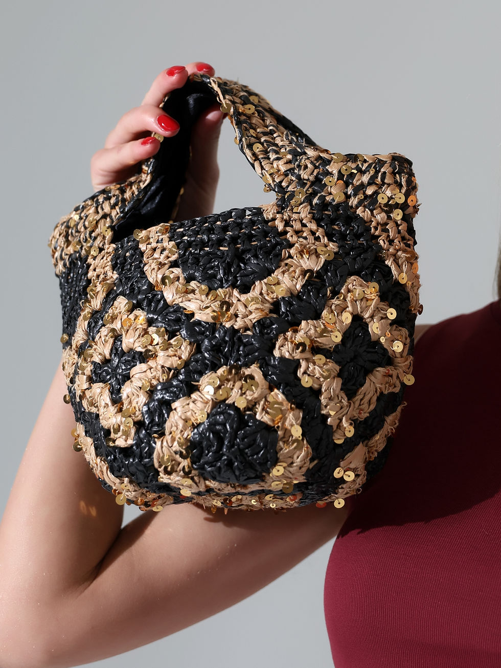 Camel ve Siyah Rafta ve Pullu İp ile örülmüş çanta